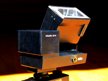 Fotoblitzgerät Braun Ultrablitz 28M mit zuschaltbarer computergesteuerter Einstellung von Reichweite und Tiefenschärfe. Mit AM-Batterien oder NC-Akkus zu betreiben. Anschluss an die Kamera mittels Blitzschuh oder dem mitgelieferten Synchronkabel möglich.